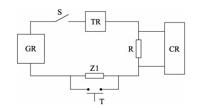 依據標準中對電氣防火限流保護器電氣性能測試的相關規定,短路限流測試電路如圖1所示,過負荷保護測試電路如圖2所示。圖1和圖2中的GR為電壓源、TR為被測試樣、S為單刀單擲開關、R為0.01Ω無感取樣電阻、CR為示波器、T為按鈕開關、Z1為3~6A阻性負載,圖2中A為鉗式電流表、Z2為25~50A阻性負載。