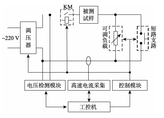 硬件設計主要包括工控機、供電單元、可調負載、高速電流采集模塊、短路支路和電壓檢測模塊的選擇與設計。工控機選用研華公司的IPC-610L;可調負載型號為RXF-AC220V 1-64A交流負載,可調負載上安裝有DC24V繼電器,可通過控制繼電器進行阻值切換;高速電流采集模塊選用固緯MDO-2000E系列多功能混合域示波器,頻率帶寬200MHz,較大實時采樣率可以達到1GSa/s。