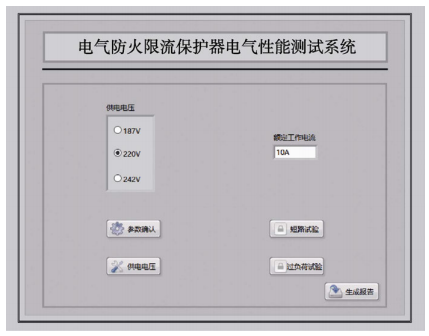 為了實現測試裝置的研發與測試標準的報批同步進行,為標準正式出臺后的順利實施奠定基礎。為此,在滿足測試標準要求的測試方法基礎上,進一步提高測試效率,降低測試成本,設計開發了一套基于LabVIEW的電氣防火限流保護器電氣性能自動測試裝置,利用該測試裝置可以實現對多種規格的電氣防火限流保護器電氣性能自動測試,測試內容包括短路限流測試、過負荷保護測試和電壓波動測試。在測試結束之后自動生成測試報告,實現了對電氣防火限流保護器電氣性能測試的自動化和智能化。