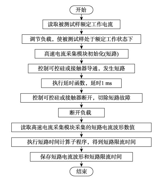 短路限流測試程序流程和過負荷保護測試程序流程分別如圖8和圖9所示。對測試裝置的供電電壓進行調整確認之后,在測試軟件界面點擊短路限流測試按鍵或過負荷保護測試按鍵,便可以進行短路限流測試或過負荷保護測試,執行相應的流程,得到短路電流波形、過負荷電流波形、短路限流時間和過負荷保護時間,并將波形和數據保存,用于后期生成測試報告。